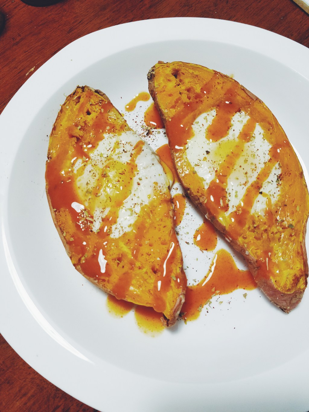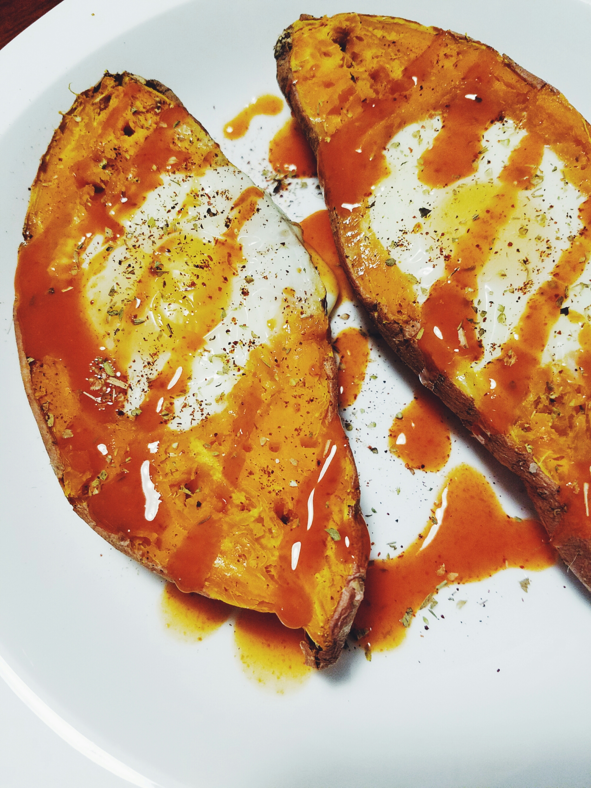 Preheat oven to 350. Stab potato with a fork all over. Microwave 5 minutes, flip, and then another 5 minutes. Carefully cut potato in half and place on tinfoil covered pan thats lightly sprayed with non stick spray. Spoon out about 2 tbsp of sweet potato from each half. Add eggs. Bake for about 20 – 30 minutes or until egg is fully cooked.