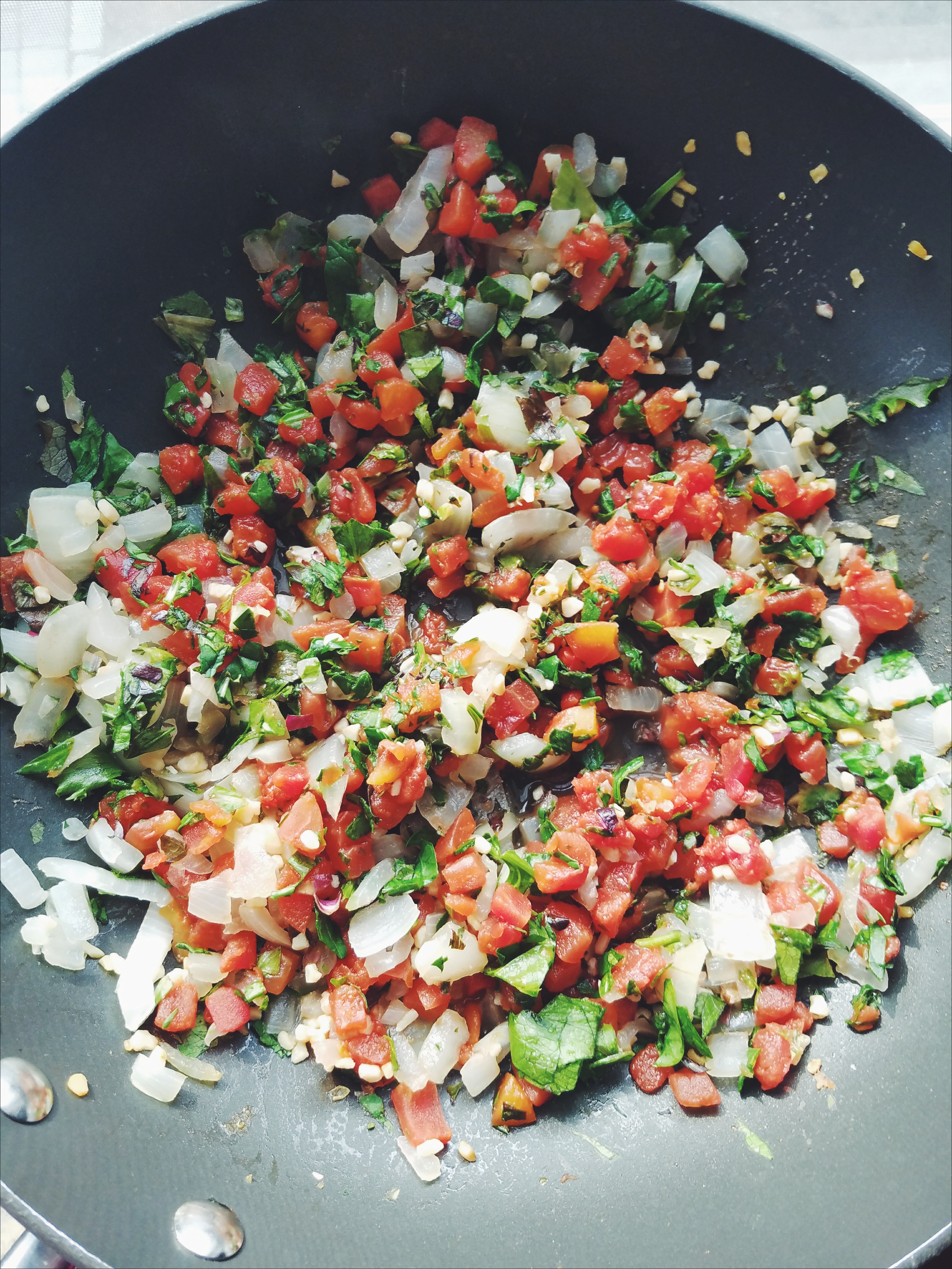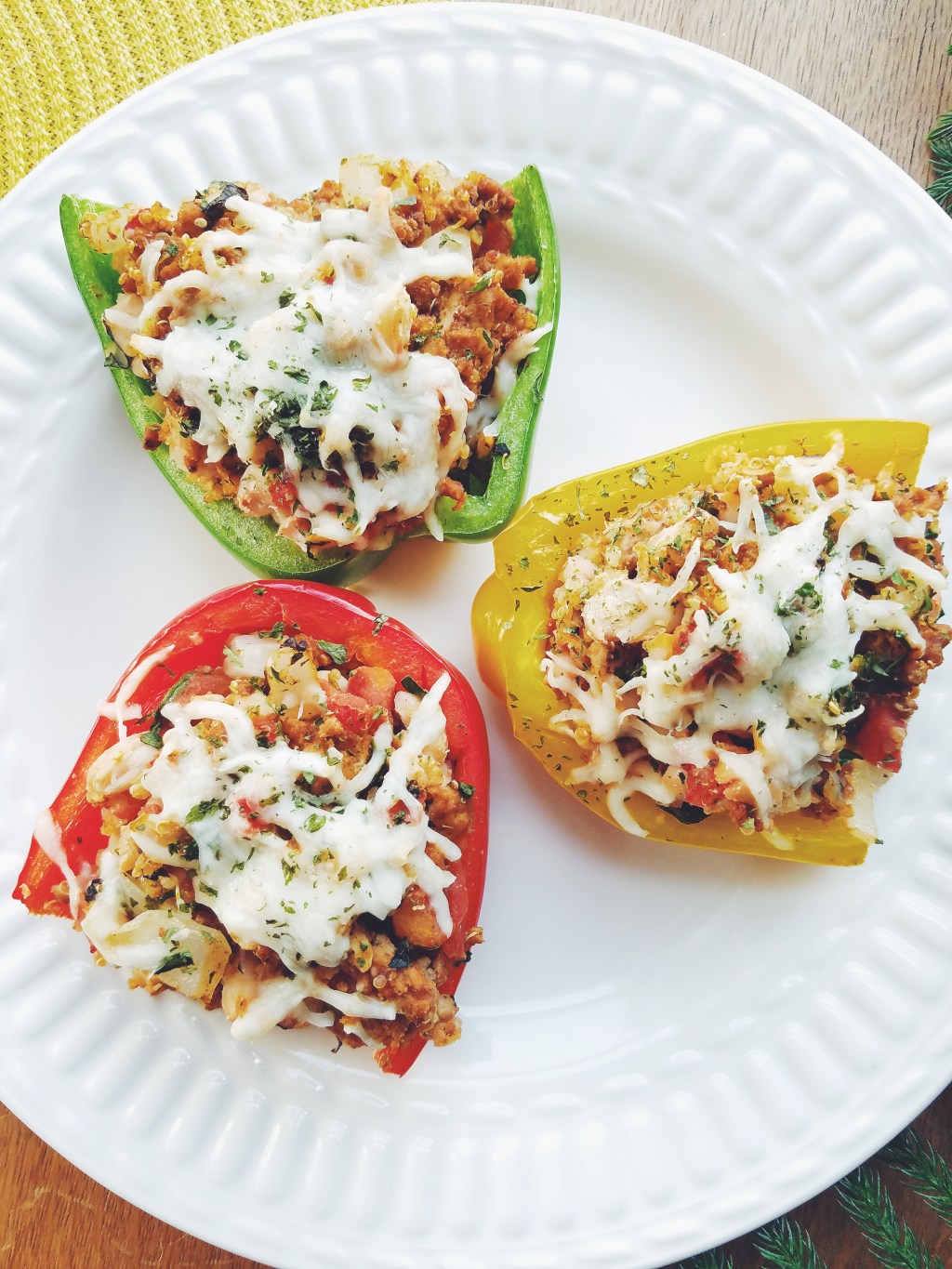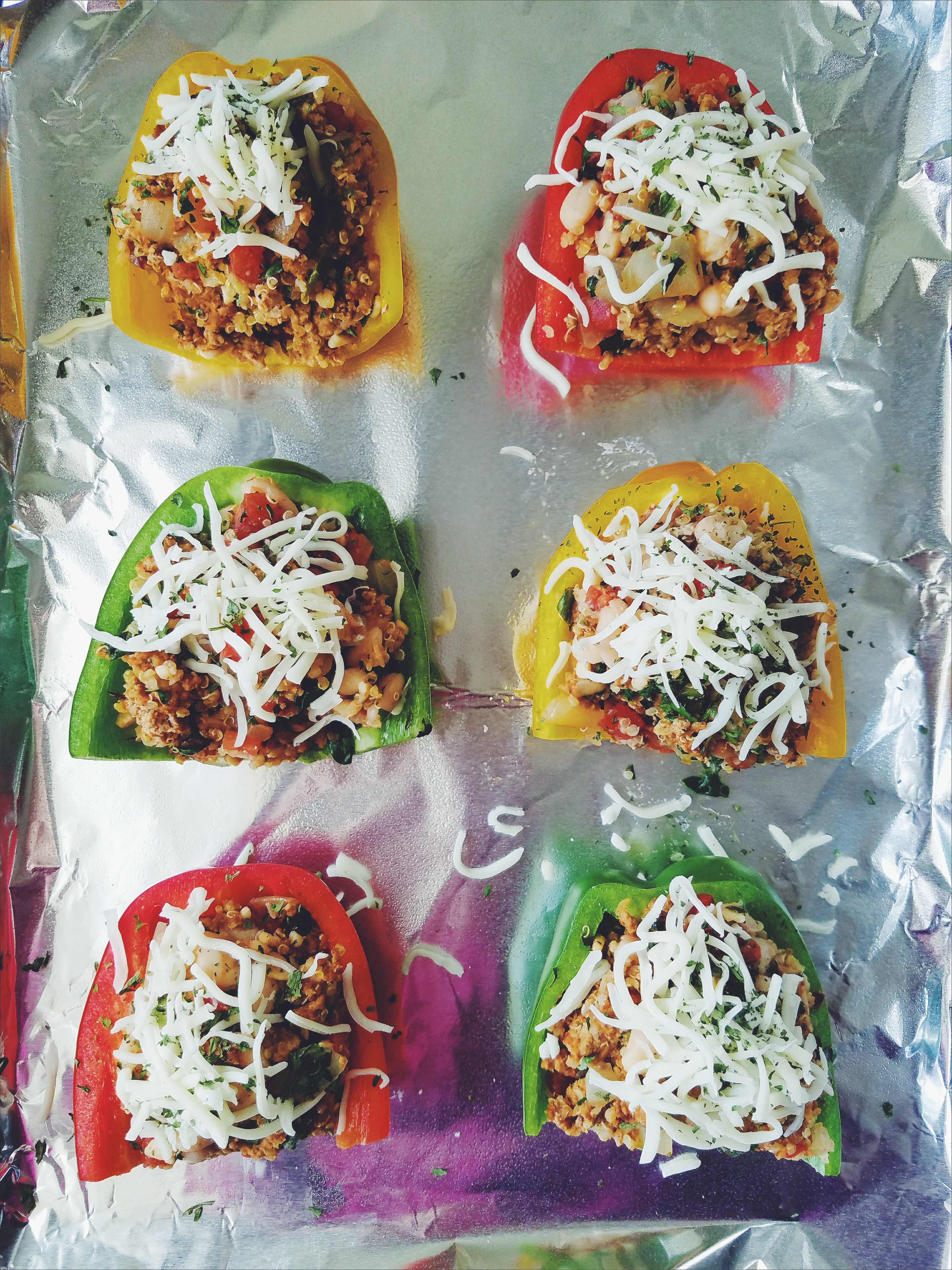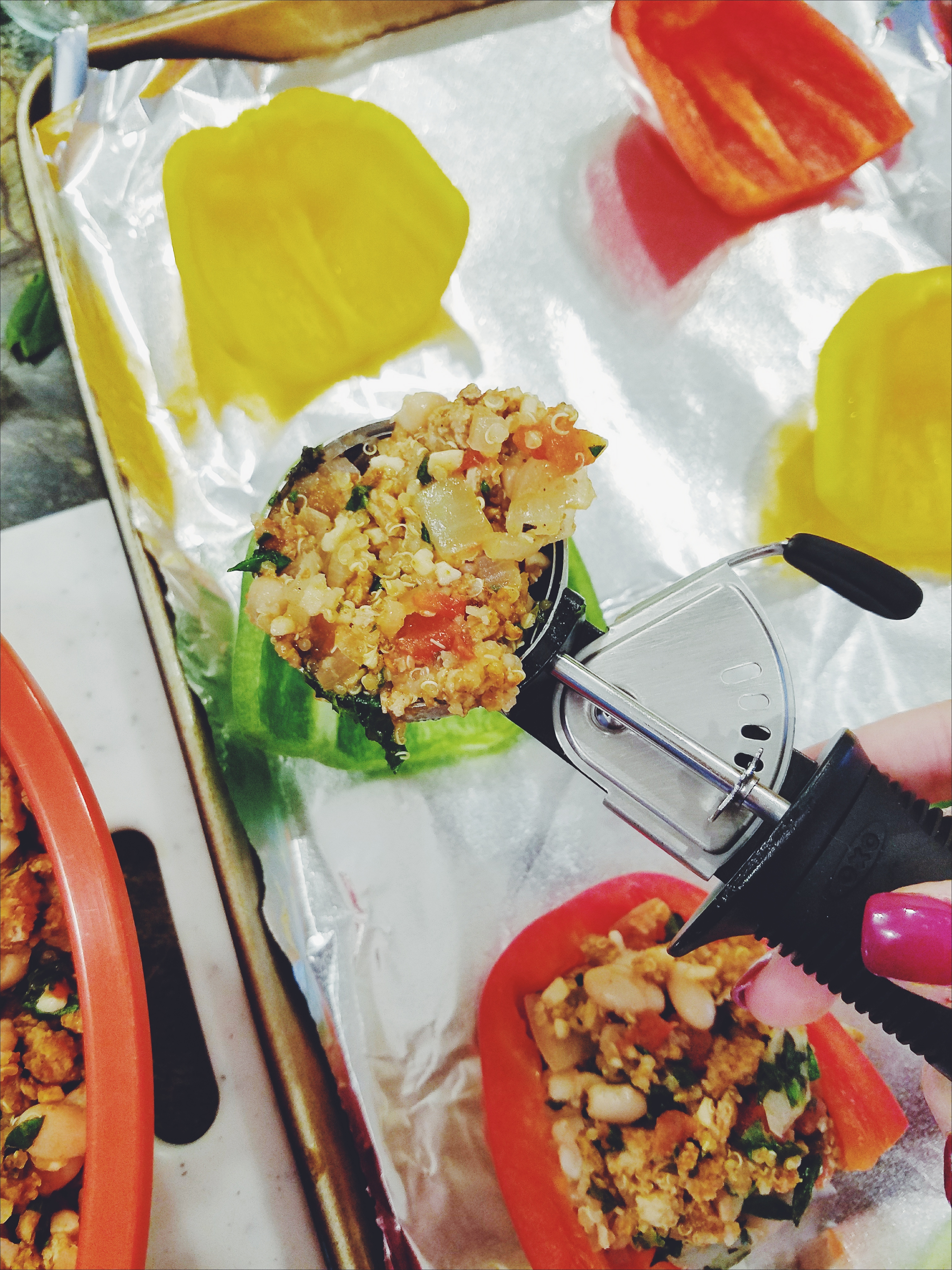 We’re possibly getting two feet of snow tomorrow, so today was the perfect day to prepare some good food! I’ve been wanting to make stuffed peppers for a while and this seemed like a good combination. They were also SO easy and quick to put together. I found that using an ice cream scoop to stuff the peppers worked really well!