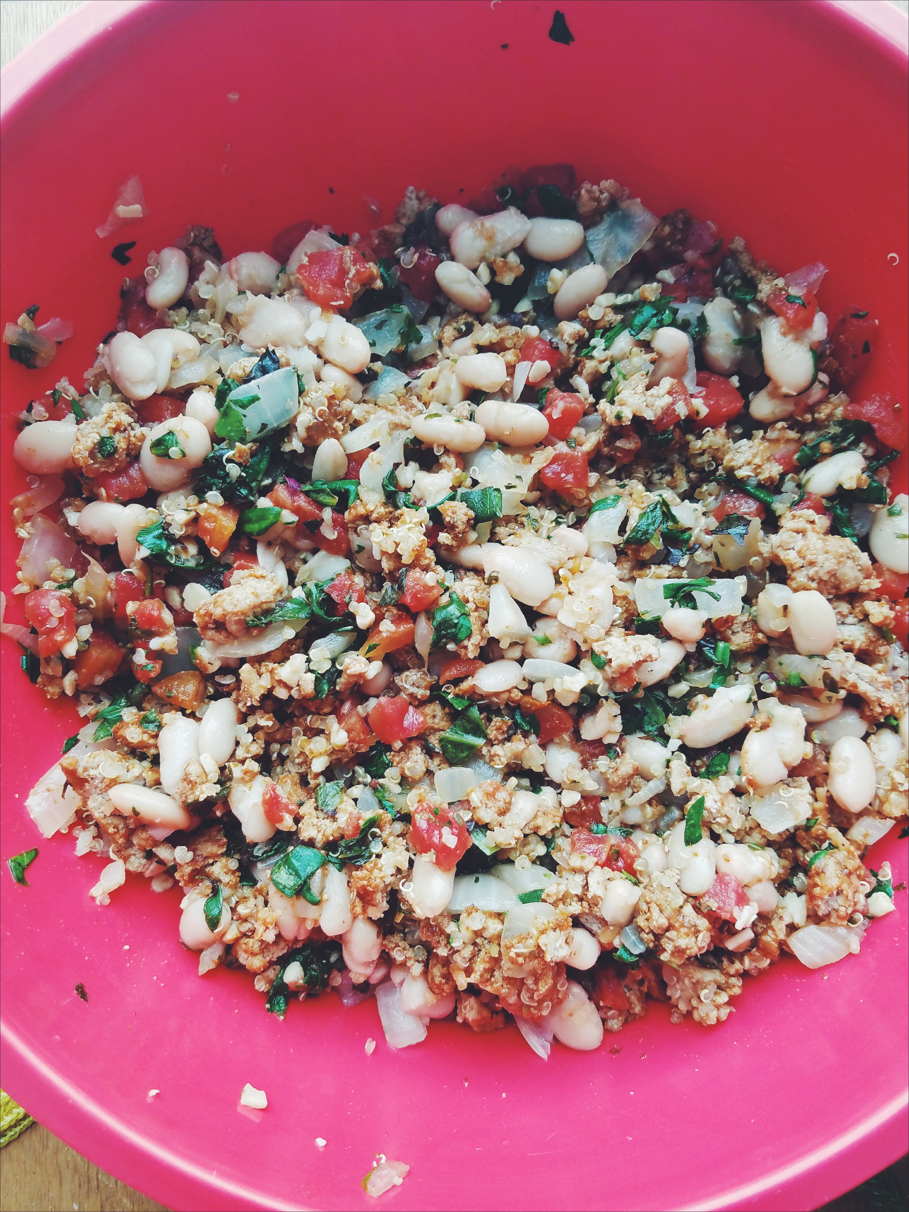 Preheat oven to 350. Boil chicken broth (or water) in a small pot. Once boiling add quinoa. Simmer for about 10 minutes. Sautée onions and garlic in a large pan for about 3-5 minutes. Add ground turkey and seasoning packet and cook for about 10 minutes. Add tomatoes, beans, and spring mix. Let cook for about 5 minutes, or until turkey is fully cooked. In a large bowl, combine quinoa and turkey mixture. Place pepper halves on foil on a sheet pan sprayed with non-stick spray. Add filling to peppers – I used an ice cream scoop! Evenly distribute the cheese on top of each pepper. Bake for about 10-15 minutes.